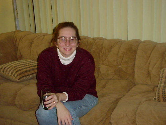 Sitting on the couch drinking water.